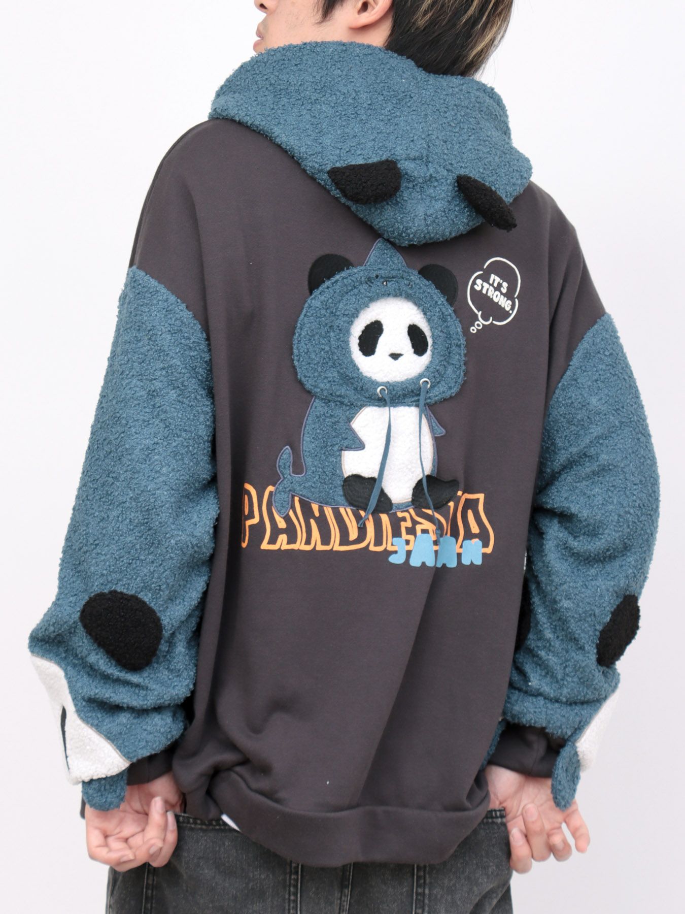 背中に描かれたちょこんと座るシャークパンダ。あれっ!?フードの紐が飛び出してる!?シャークパーカー着てるパンダでした。