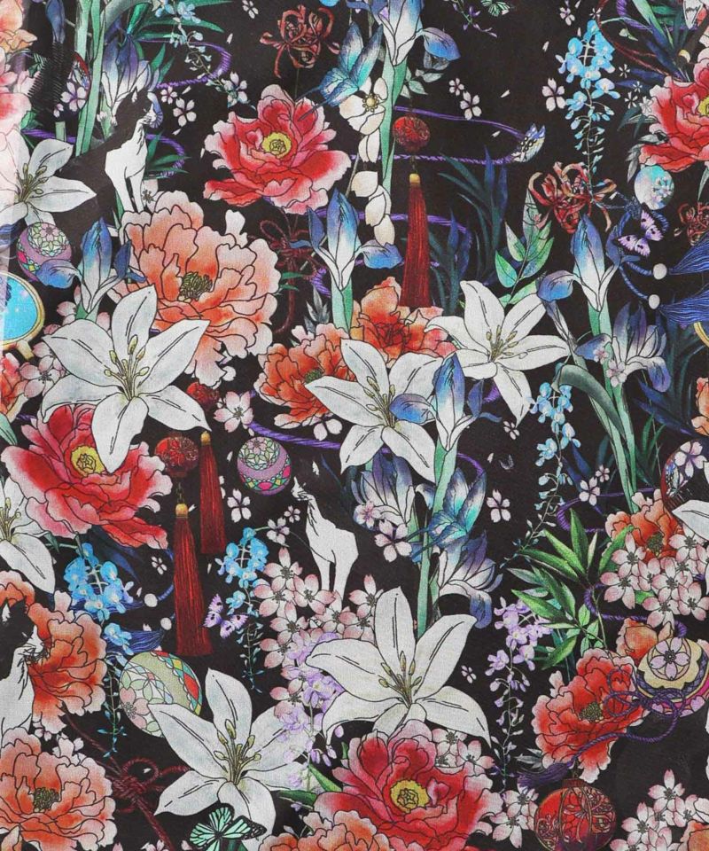 こちらは、ゆったりとしたワイドシルエットに、繊細な和柄をプリントした薄手シフォンを重ねた風にふわりとなびくエアリーパンツ。