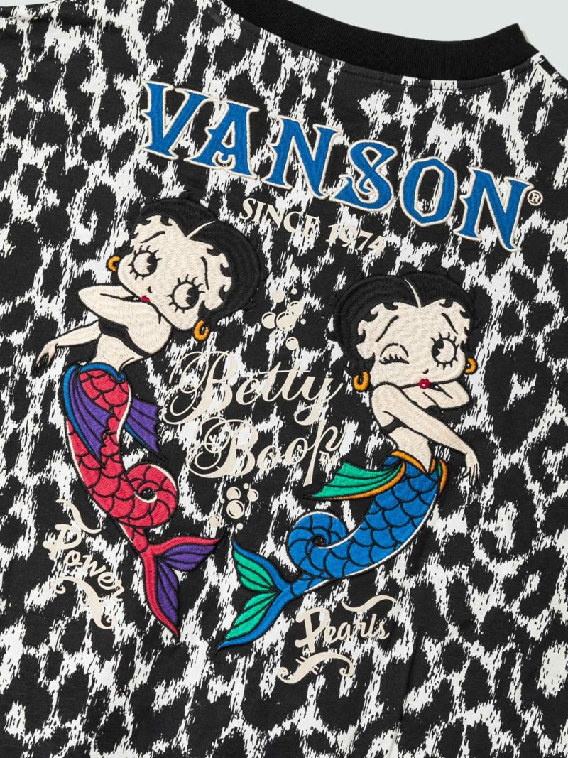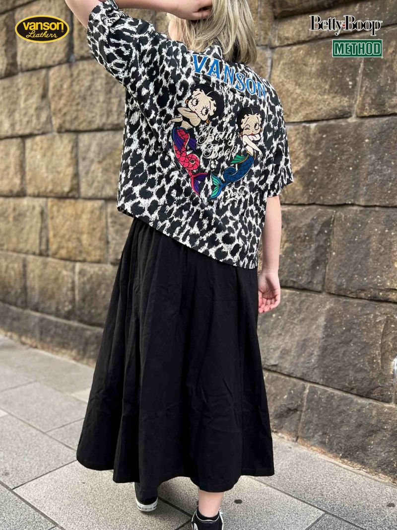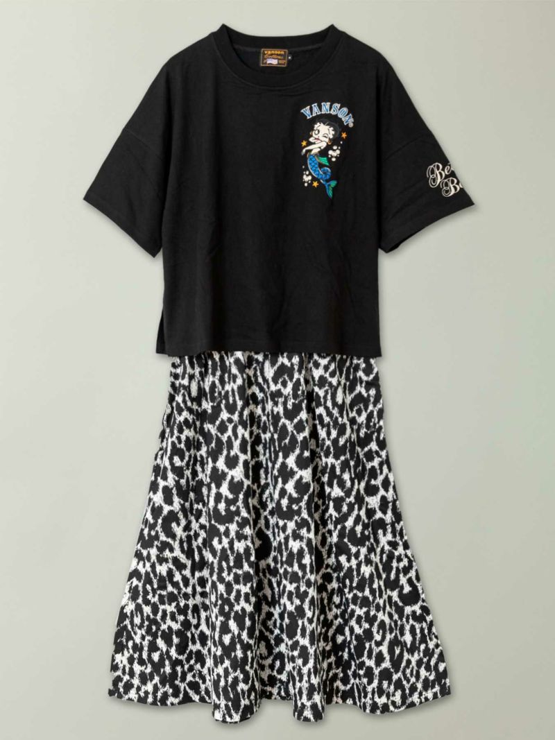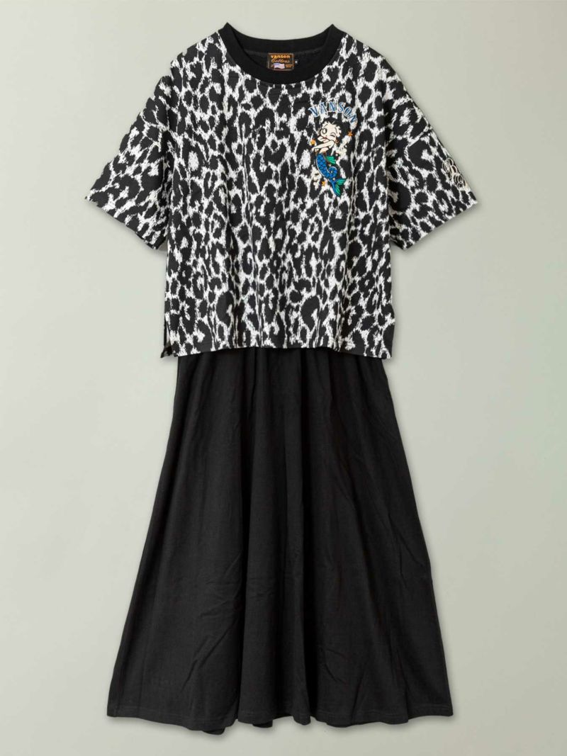 - ≪50%OFF≫【VANSON×BETTY BOOP】“マーメイドベティ”刺繍入りフェイクレイヤード半袖ワンピース〔別注〕≪返品・取寄対応不可≫
