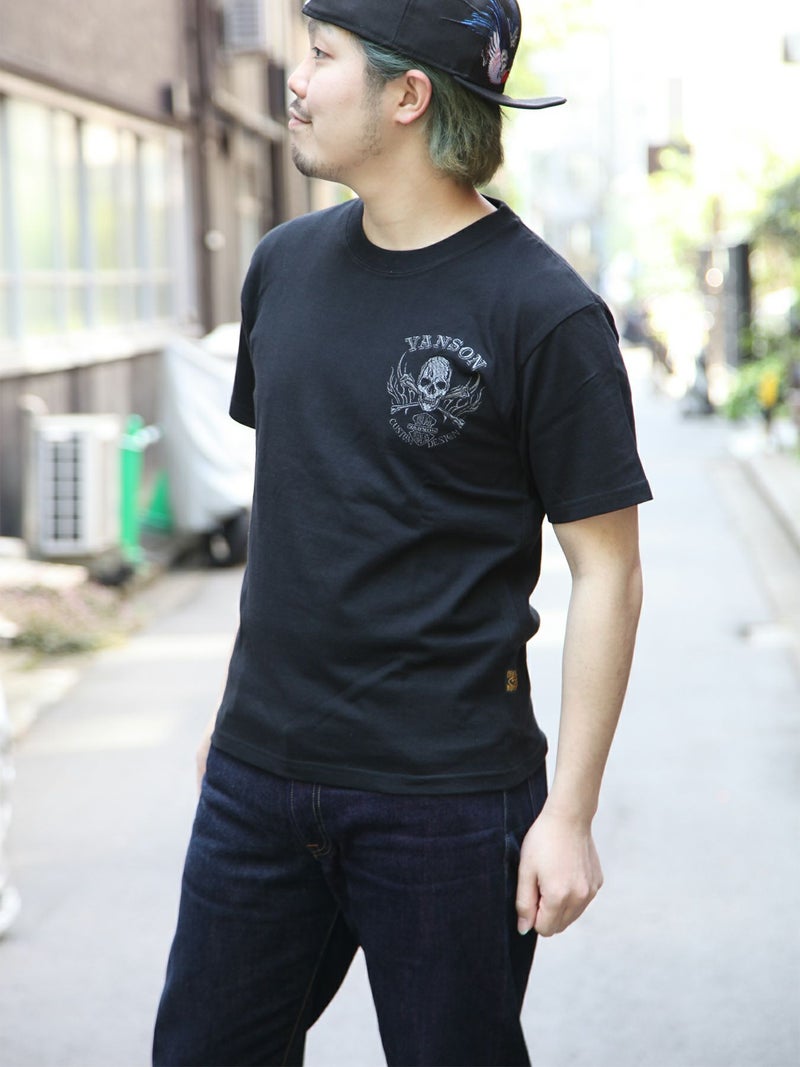 5. 【VANSON】“スカルファイヤー”モノトーン刺繍Tシャツ