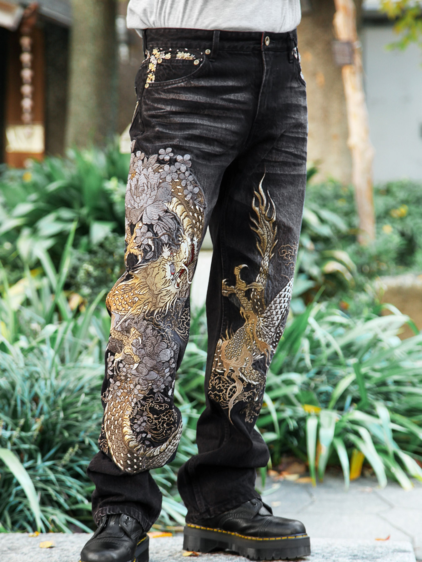“龍牡丹”総刺繍 金襴切替デニムパンツ30,800円(税込)